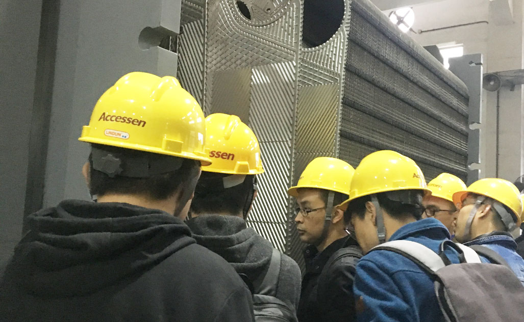 隨后,設(shè)計(jì)師們分別參觀了謝春路生產(chǎn)車間及太倉工廠生產(chǎn)車間。在生產(chǎn)車間內(nèi),設(shè)計(jì)師近距離接觸到板式換熱器,換熱機(jī)組,戶外魔方集裝箱式換熱站等產(chǎn)品,親手觸摸換熱板片,也提出了很多寶貴的建議。參觀中,艾克森工廠的先進(jìn)的生產(chǎn)設(shè)備,包括電泳涂裝生產(chǎn)線和自動(dòng)化焊接機(jī)器人、換熱機(jī)組全性能測試平臺(tái)、E-cloud智慧能源系統(tǒng)等設(shè)備,完善的機(jī)組測試、機(jī)器人自動(dòng)切割、焊接生產(chǎn)線以及涂裝生產(chǎn)線,給設(shè)計(jì)師留下了深刻的印象,讓大家感受到現(xiàn)代工業(yè)智能化生產(chǎn)的科技感。通過此次實(shí)地參觀考察和技術(shù)交流,上海院設(shè)計(jì)師對(duì)艾克森公司的技術(shù)實(shí)力以及企業(yè)文化等方面更加的了解和認(rèn)同。也為新產(chǎn)品和新的設(shè)計(jì)理念提供了更多的選擇,將技術(shù)和產(chǎn)品更好的結(jié)合,推動(dòng)行業(yè)更好的發(fā)展。